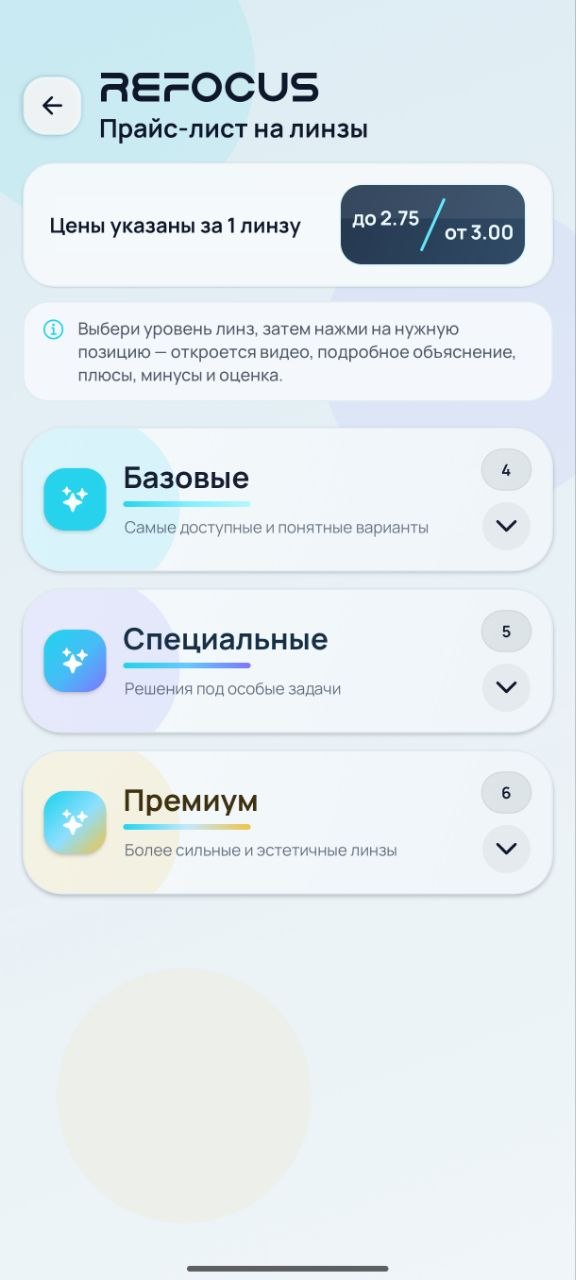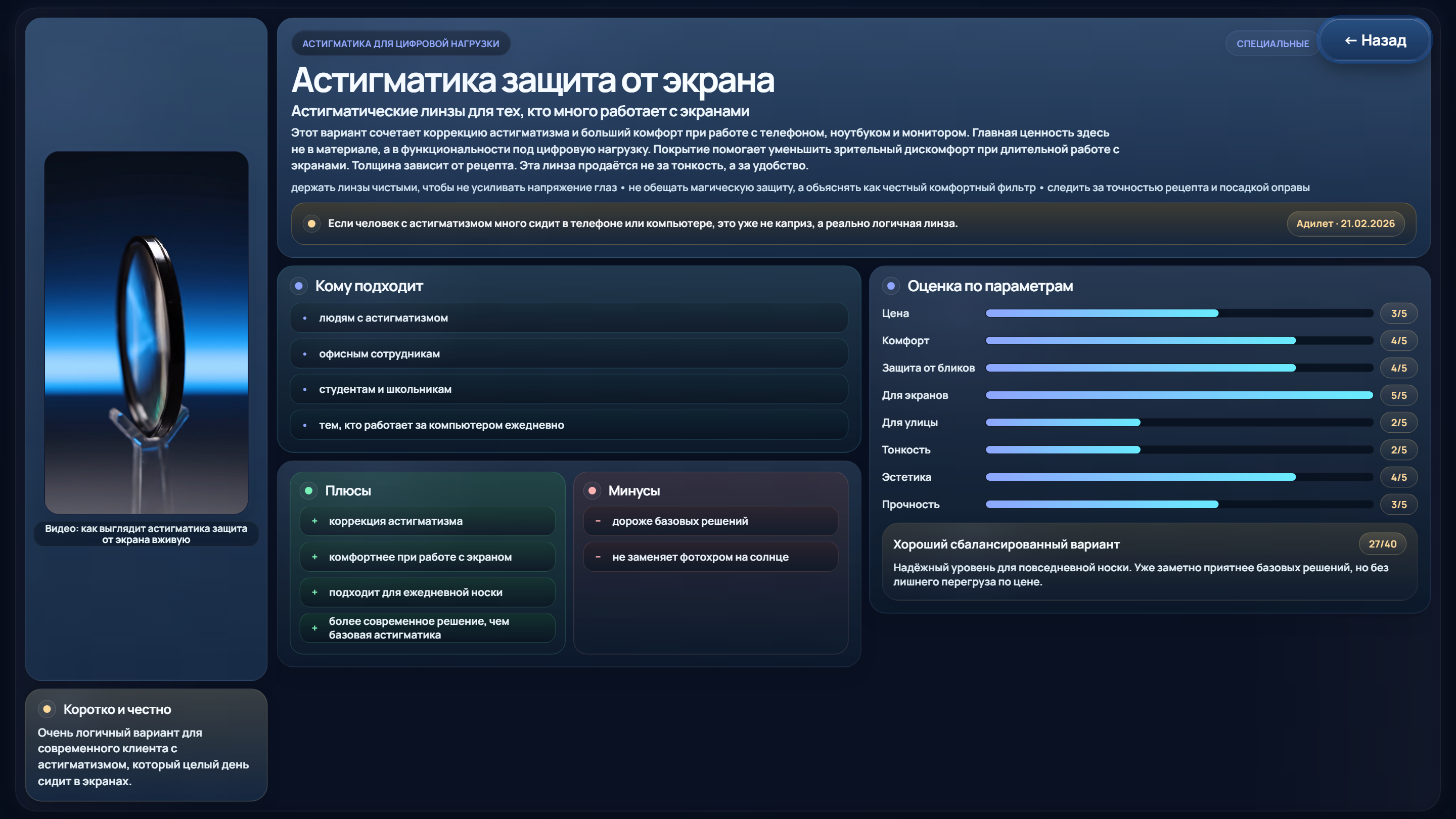 Клиент сам изучает виды линз, цены, характеристики и смотрит видеообзоры. Базовые, Специальные, Премиум — всё наглядно.