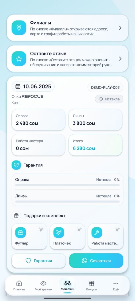 Заказ с видео-этапами, контроль зрения, бонусная лестница, прайс на линзы — в смартфоне каждого клиента.