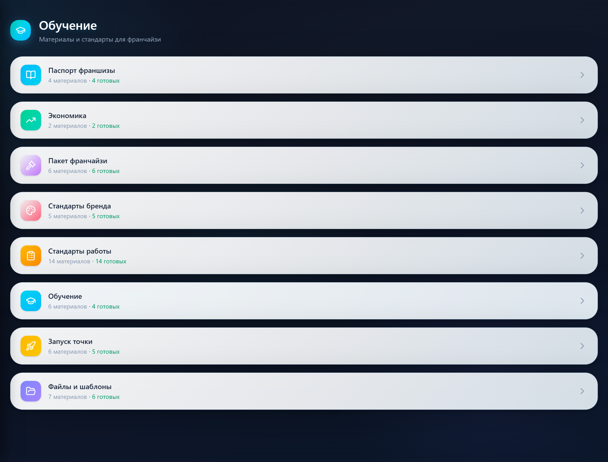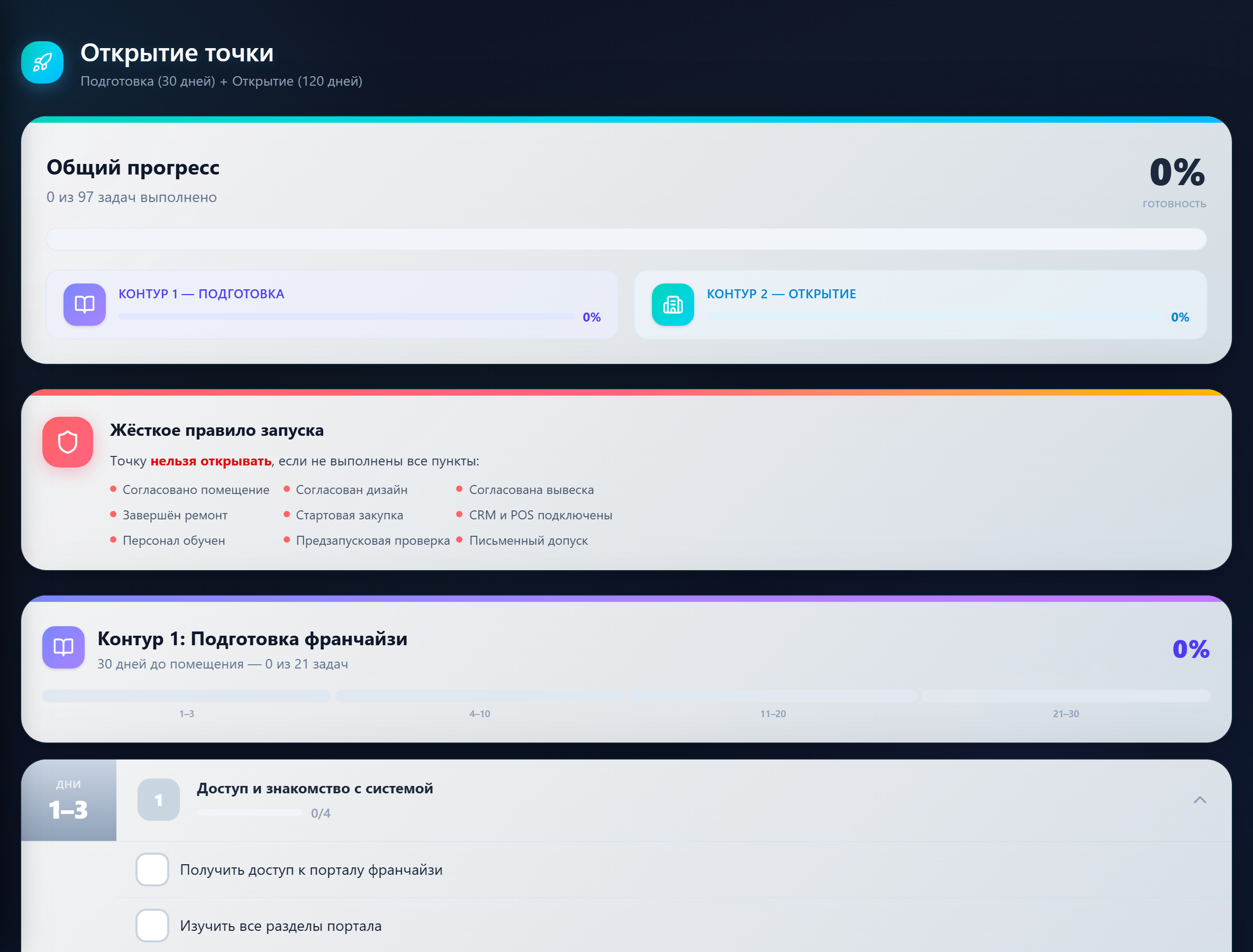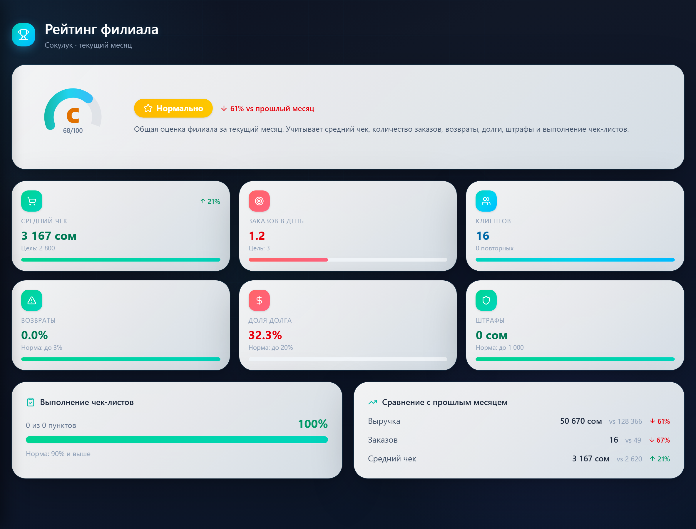 Выручка, заказы, клиенты, склад, зарплаты, рейтинг, обучение, чат с HQ — всё в одном месте.